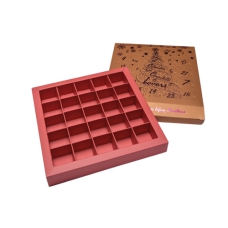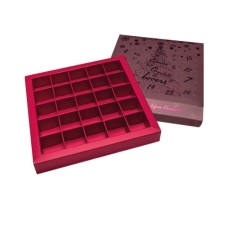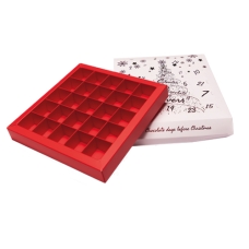 Adventskalender 188x188/30mm (25 vak van 37x37mm)- doos: Strawberry, sleeve: White + druk: Shiny red/shiny gold