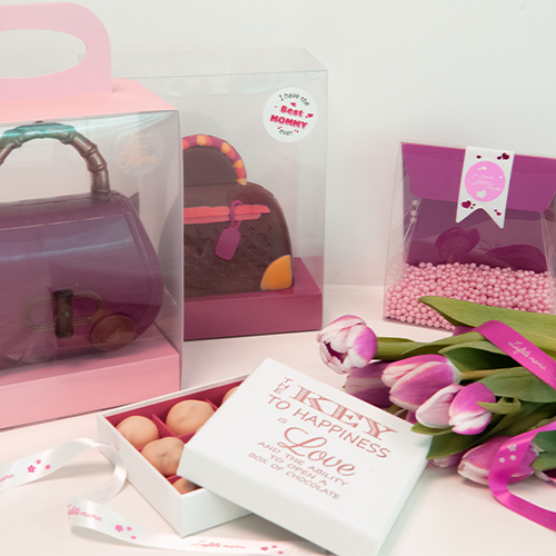 etiketten 40x40mm 'Mom needs chocolate' shiny fuchsia + white (500 st)