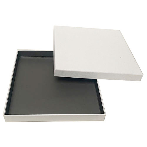Royal box WIT 36 pralines (204x204/25mm) met inlegger Warm grey opaque Set bestaande uit: *1x royal box WIT (harde bodem-deksel doos) voor 36 pralines buitenafmetingen: 216x216/30mm binnenafmetingen: 206x206/25mm *1x inlegger voor de royal box in WARM GREY opaque met afmetingen 204x204/23mm