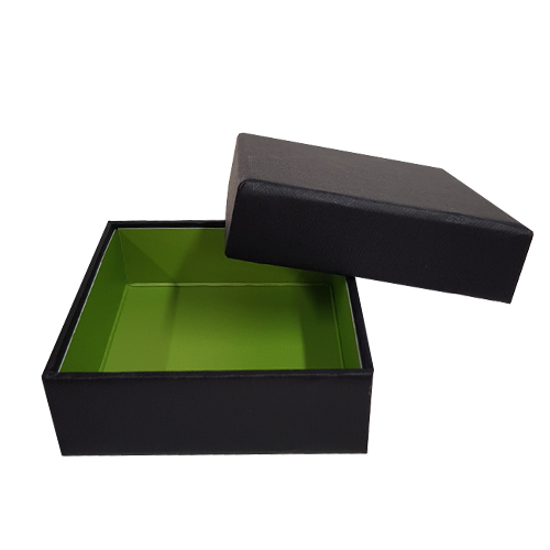 Royal box ZWART 4 pralines (70x70/25mm) met inlegger Kiwi green opaque Set bestaande uit: *1x royal box ZWART (harde bodem-deksel doos) voor 4 pralines buitenafmetingen: 82x82/30mm binnenafmetingen: 72x72/25mm *1x inlegger voor de royal box in Kiwi green opaque met afmetingen 70x70/23mm Dit produkt wordt verkocht per 24 stuks Apart te verkrijgen: - rijverdeling van 2 horizontale rijen (code = RIJ 2 ROYAL BOX 4) beschikbaar in 23 kleuren - vakverdeling voor 4 pralines (praline per praline) (code = VAK 4 ROYAL BOX 4) beschikbaar in 23 kleuren (Deze vakverdeling wordt verkocht per 48 stuks) - pvc afdekvel (code = PVC VEL 69x69) - cushion pad (code = CUS PAD 72) in zwart of wit Personalisatie is mogelijk vanaf 96 stuks