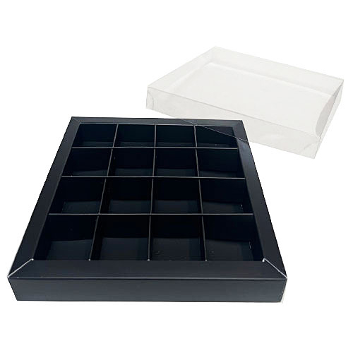 Luxevensterdoos N°15 146x146/24mm (vak 36x36mm) duo PARIS / BLACK opaque Luxevensterdoos N°15 met 16 vakjes van 36x36mm (praline per praline)