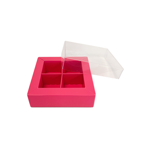 Luxevensterdoos N°17 met 4 vakjes van 37x37mm (praline per praline)Kleur: FUCHSIA opaqueBinnenafmetingen 74x74/29mmBuitenafmetingen 102x102/30mm