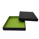 Royal box ZWART 36 pralines (204x204/25mm) met inlegger Kiwi green opaque Set bestaande uit: *1x royal box ZWART (harde bodem-deksel doos) voor 36 pralines buitenafmetingen: 216x216/30mm binnenafmetingen: 206x206/25mm *1x inlegger voor de royal box in KIWI GREEN opaque met afmetingen 204x204/23mm