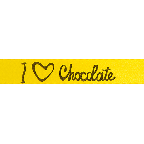 Omschrijving : prestige 25mm/100m "I love chocolate" col. 220 paasgeel+brons